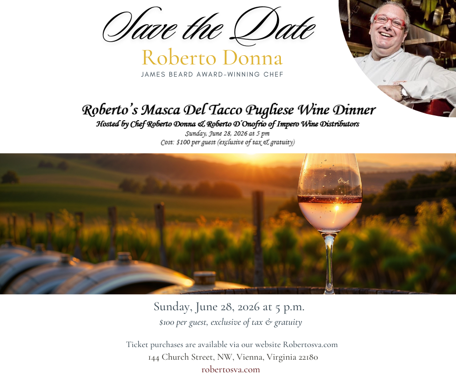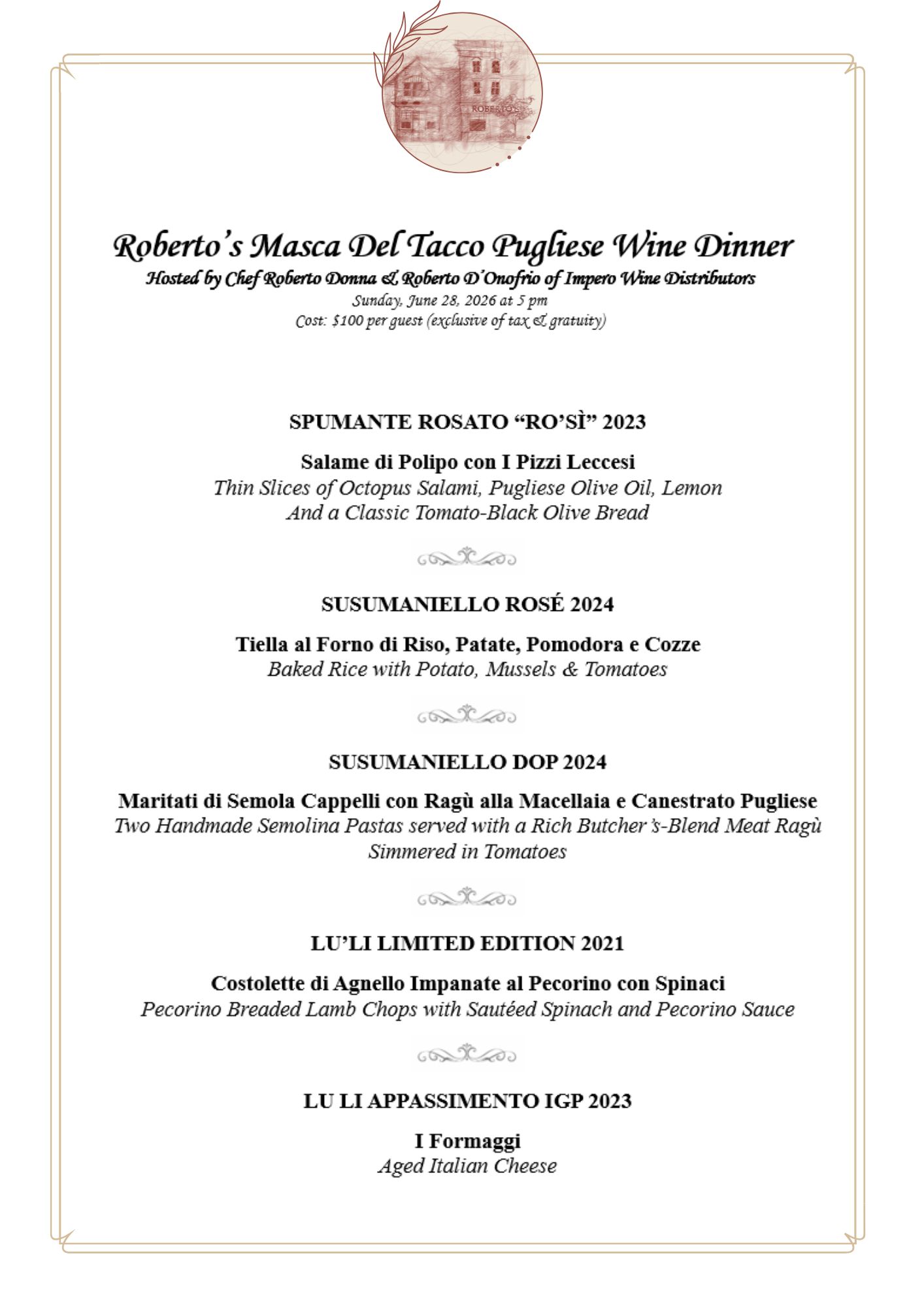 Roberto's Masca Del Tacco Pug;iese Wine Dinner - June 28, 2026