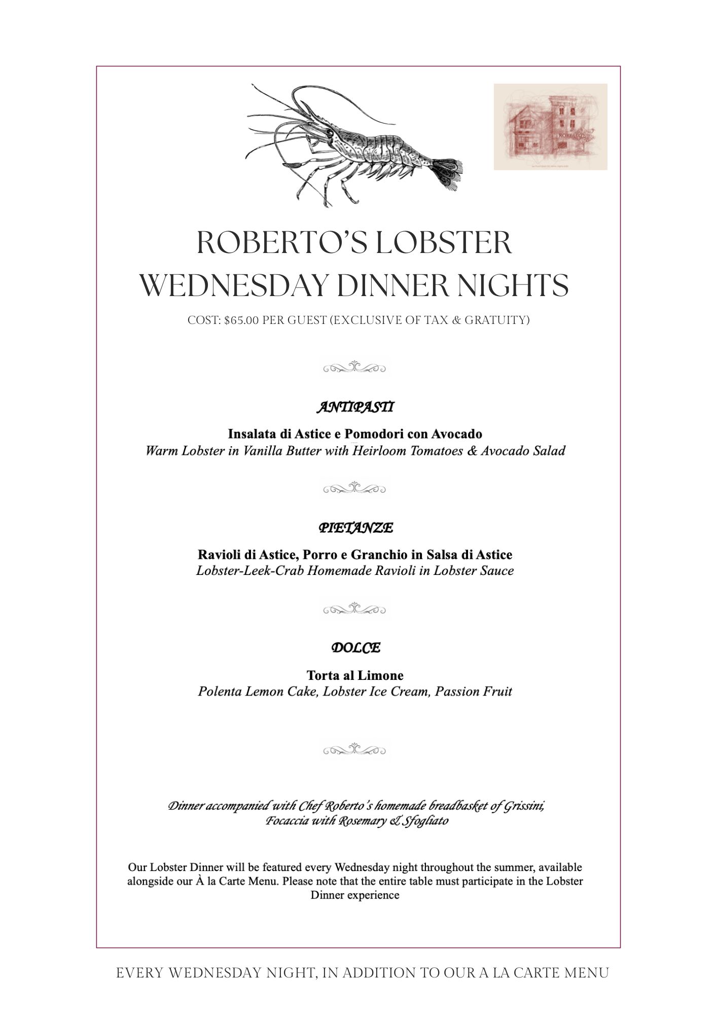 Starting July 30th, join us every Wednesday night for a lobster dinner — just $65 per person (plus tax & gratuity)