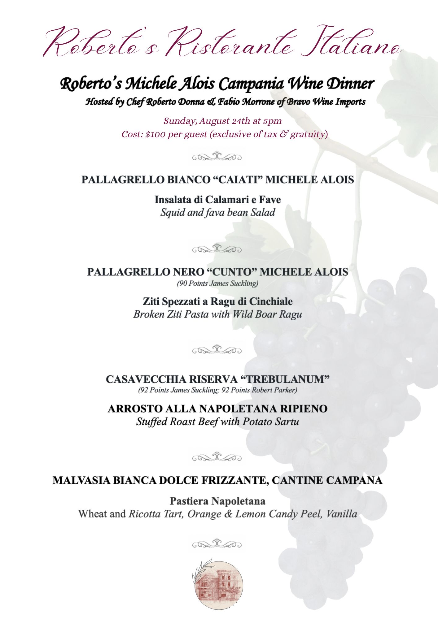 Roberto's Michele Alois August Campania Wine Dinner August 25 2025 | 144 Church Street NW, Vienna, VA 22180 Sold Out