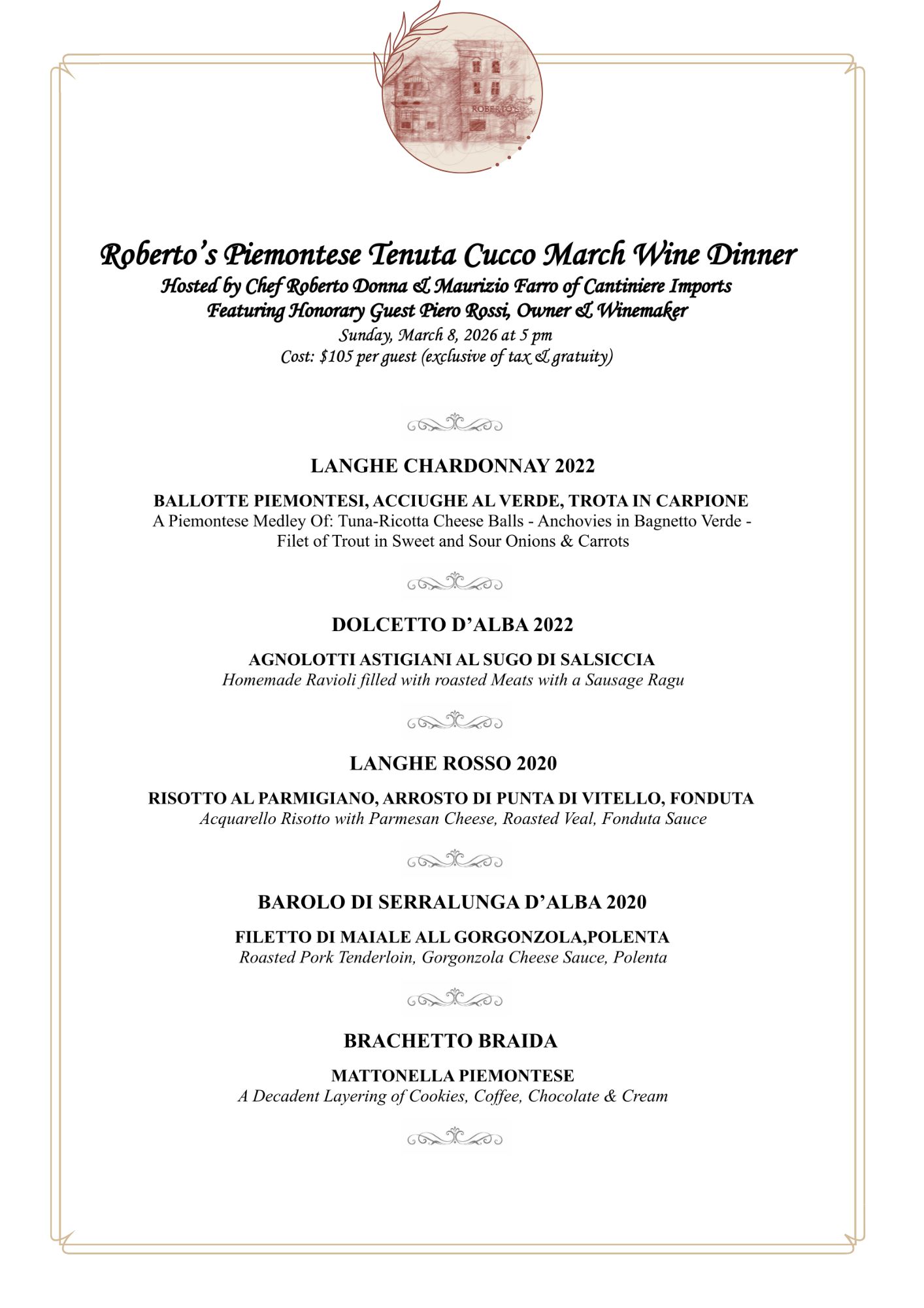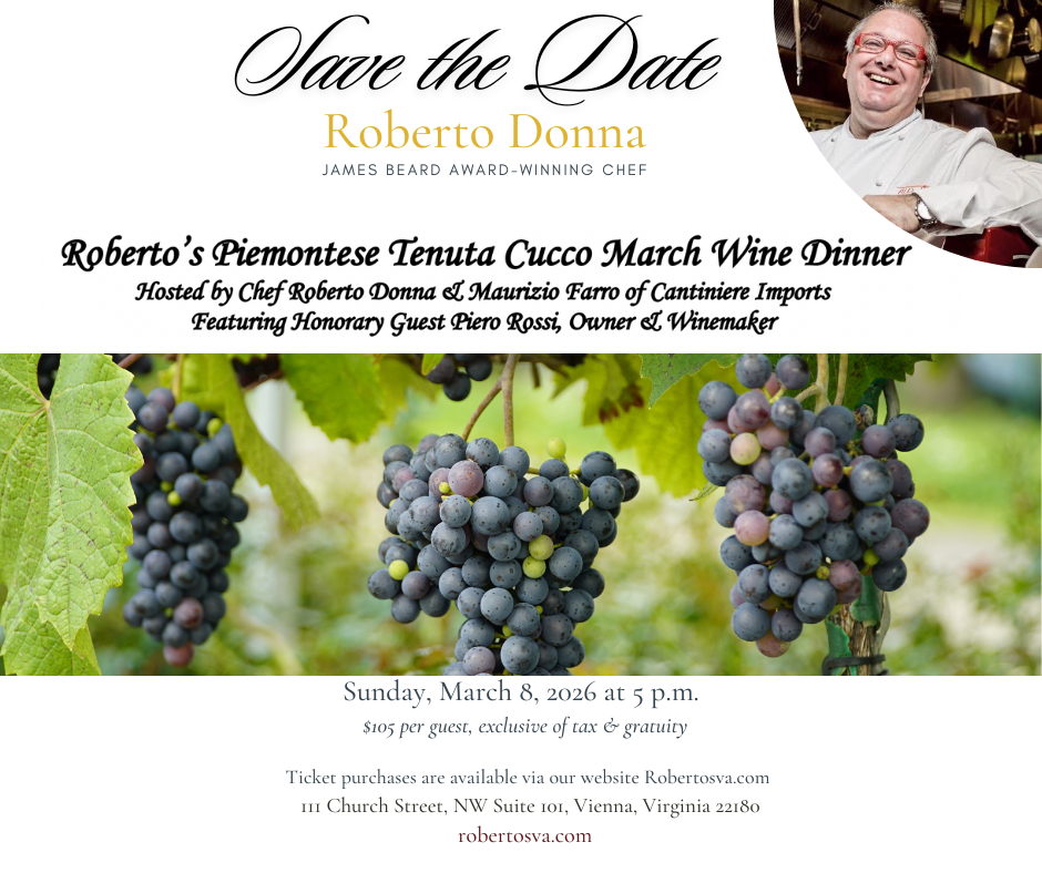Roberto's Piemontese Tenuta Cucco March Wine Dinner March 8 2026 | 144 Church Street NW, Vienna, VA 22180 Purchase Tickets $136.50 Please, select a ticket type Ticket Type* Ticket Type Piemontese Tenuta Cucco March Wine Dinner (Inclusive of Tax & Gratuity) - $136.50 Please, enter a valid first name First Name* Please, enter a valid last name Last Name* Please, enter a valid email Email* Please, enter a valid phone Phone* Add Ticket To Cart Please check errors in the form above.