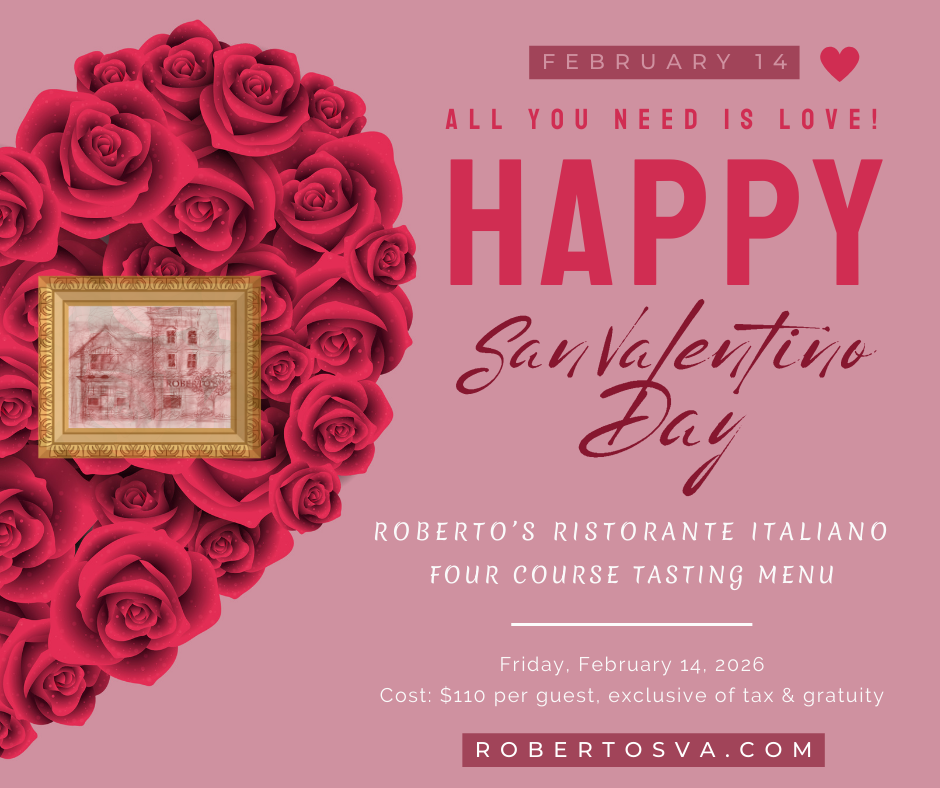 Roberto's San Valentino Four - Course Menu February 14 2026 | 144 Church Street NW, Vienna, VA 22180 Purchase Tickets $143.00 Please, select a ticket type Ticket Type* Ticket Type 5 PM - Roberto's San Valentino (Inclusive of Tax & Gratuity) - $143.00 5:15 PM - Roberto's San Valentino (Inclusive of Tax & Gratuity) - $143.00 5:30 PM - Roberto's San Valentino (Inclusive of Tax & Gratuity) - $143.00 5:45 PM - Roberto's San Valentino (Inclusive of Tax & Gratuity) - $143.00 6 PM - Roberto's San Valentino (Inclusive of Tax & Gratuity) - $143.00 6:15 PM - Roberto's San Valentino (Inclusive of Tax & Gratuity) - $143.00 6:30 PM - Roberto's San Valentino (Inclusive of Tax & Gratuity) - $143.00 6:45 PM - Roberto's San Valentino (Inclusive of Tax & Gratuity) - $143.00 7 PM - Roberto's San Valentino (Inclusive of Tax & Gratuity) - $143.00 7:15 PM - Roberto's San Valentino (Inclusive of Tax & Gratuity) - $143.00 7:30 PM - Roberto's San Valentino (Inclusive of Tax & Gratuity) - $143.00 7:45 PM - Roberto's San Valentino (Inclusive of Tax & Gratuity) - $143.00 8 PM - Roberto's San Valentino (Inclusive of Tax & Gratuity) - $143.00 8:15 PM - Roberto's San Valentino (Inclusive of Tax & Gratuity) - $143.00 8:30 PM - Roberto's San Valentino (Inclusive of Tax & Gratuity) - $143.00 8:45 PM - Roberto's San Valentino (Inclusive of Tax & Gratuity) - $143.00 9:00 PM - Roberto's San Valentino (Inclusive of Tax & Gratuity) - $143.00 Please, enter a valid first name First Name* Please, enter a valid last name Last Name* Please, enter a valid email Email* Please, enter a valid phone number Phone Number* Add Ticket To Cart Please check errors in the form above.